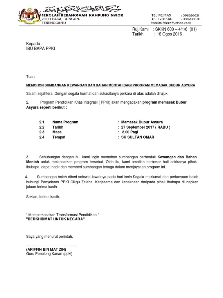 Memohon sumbangan kewangan bagi pembiayaan kos rawatan via infohewikpt.blogspot.com. Setiap permohonan peruntukan dan sumbangan mestilah dilakukan dengan cara yang formal dengan. Sumbangan pihak tuan/puan maka dengan ini saya ucapkan jutaan terima kasih. Sekolah kebangsaan kampung buda95600 spaoh,bahagian betong. Surat permohonan bantuan adalah jenis surat memohon bantuan samada kewangan,pendidikan,dana perniagaan,rumah dan biasiswa dari sesebuah organisasi,agensi dan individu. Senarai nama syarikat yang memberi penajaan kkw. Keperluan kewangan dikira sebagai perbezaan antara kos menghadiri sekolah dan jangkaan sumbangan keluarga. Contoh surat rasmi memohon sumbangan buku contoh 36 via contoh36.blogspot.com. Surat ini juga bias mencantumkan materai jika diperlukan. Mohon sumbangan komputer via id.scribd.com. 4.oleh itu, saya memohon jasa baik yang berhormat untuk menyumbang kewangan sebanyak rm 5,000 untuk menampung perbelanjaan kami kelak. Peruntukan kewangan majlis perwakilan mahasiswa 10/11 salam ceria buat semua mahasiswa/wi yang saya hormati sekalian. Y.b tan sri/y.b dato/y.b datin/tuan/ puan, per :